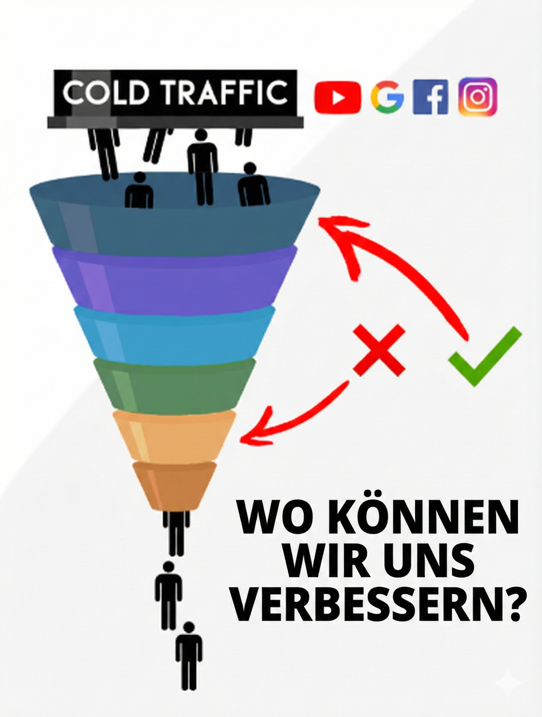 Vielleicht braucht es ein stärkeres E-Mail-Follow-up. Vielleicht muss die Conversion deiner Landingpage optimiert werden. Egal was es ist – wir nehmen die Erkenntnisse aus Schritt Eins und entwickeln daraus einen klaren Maßnahmenplan, der dein gesamtes Funnel-System spürbar verbessert.